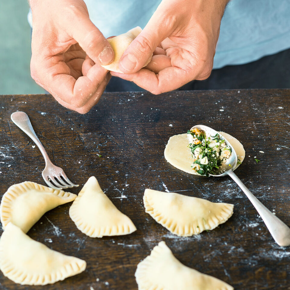 Den Backofen auf 200° vorheizen. Den Teig in 12 Portionen teilen, auf der bemehlten Arbeitsfläche zu 10 - 12 cm großen Kreisen ausrollen. Die Füllung auf eine Hälfte der Kreise setzen. Das übrige Eigelb verquirlen, die Teigränder dünn damit bestreichen. Die leeren Teighälften über die Füllung klappen, verschließen und mit einer Gabel Rillen in den Rand drücken.