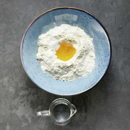 Für den Teig Mehl, Salz und Ghee nach und nach mit 150 ml kaltem Wasser in ca. 10 Min. glatt verkneten. Mit einem feuchten Tuch abdecken und ca. 30 Min. ruhen lassen.