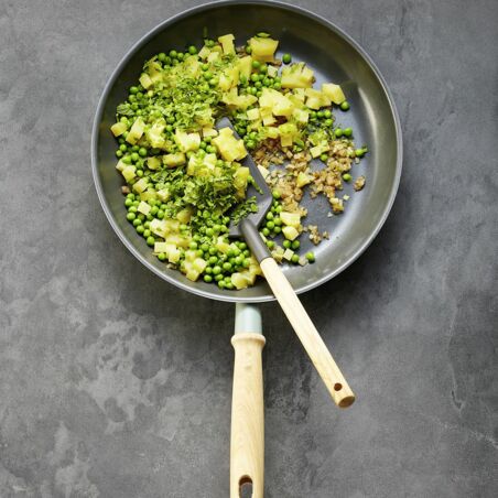 Die Zwiebelwürfel im heißen Ghee bei kleiner Hitze ca. 10 Min. andünsten. Garam Masala einrühren und alles vom Herd nehmen. Kartoffeln abgießen, pellen und ca. 0,5 cm groß würfeln. Erbsen gut abtropfen lassen. Beides mit Minze unter die Zwiebel rühren. Mit Salz und Zitronensaft abschmecken.
