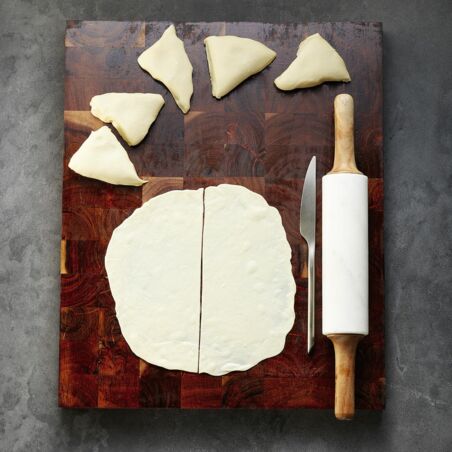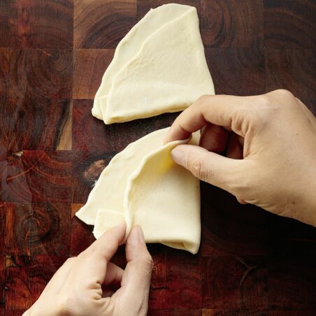Den Teig in sechs gleich große Portionen teilen, diese auf der leicht geölten Arbeitsfläche rund (à ca. 20 cm Ø) ausrollen und halbieren. Die gerade Schnittkante der Halbkreise mit Wasser bestreichen, dann leicht überlappend aufeinander legen und festdrücken, sodass ein Trichter entsteht.