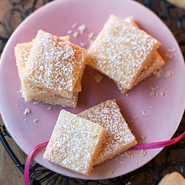 Mürbe Plätzchen für ganz Eilige: Der Mürbeteig wird kurz genketet, ausgerollt, gebacken und in Quadrate geschnitten.