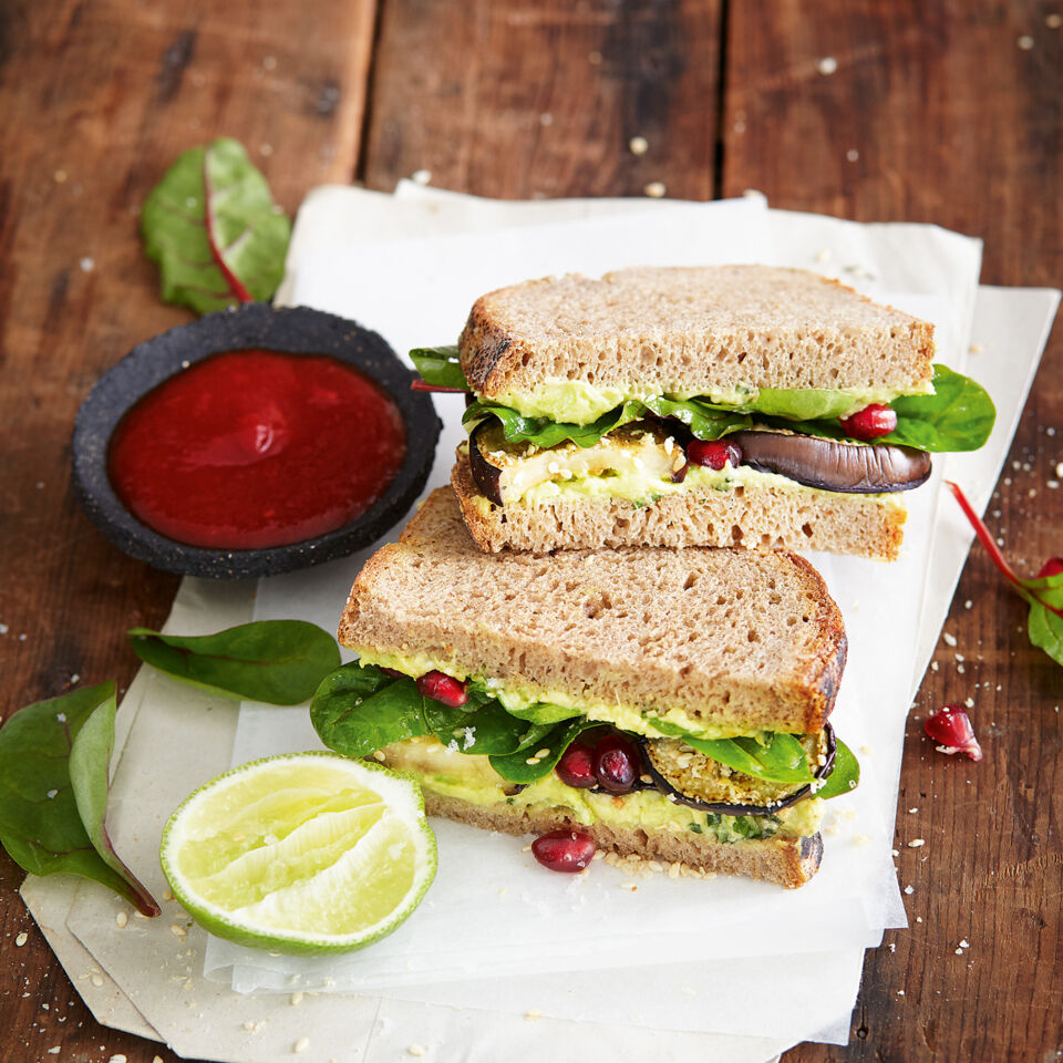 Aubergine, Spinat, Avocado, Minze und Granatapfelkerne auf einem warm servierten Sandwich? Das lassen wir uns nicht zweimal sagen!