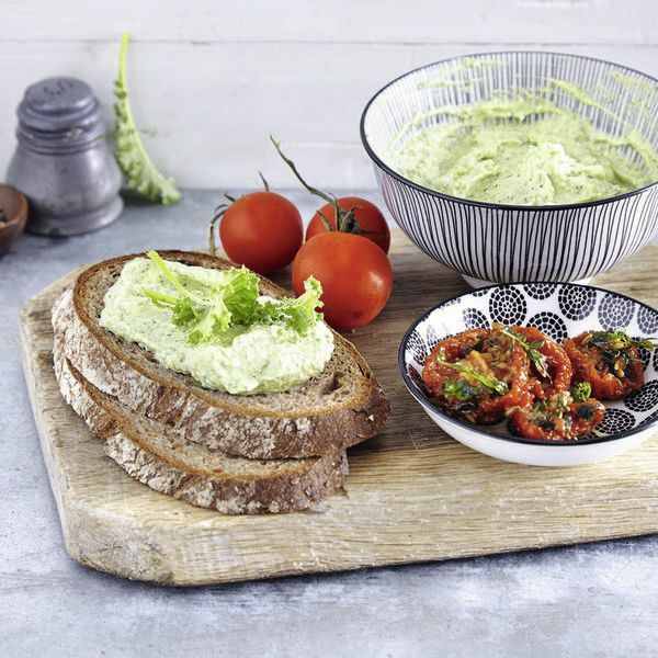 Den Kohl herausnehmen, kalt abschrecken und abkühlen lassen, dann grob hacken und ausdrücken, etwas Grünkohl beiseitelegen. Alternativ den TK-Kohl auftauen lassen und ausdrücken. Den Schafskäse mit Frischkäse, Kohl, Dill und Tomatenöl fein pürieren. Den Aufstrich mit wenig Salz und Pfeffer würzen.