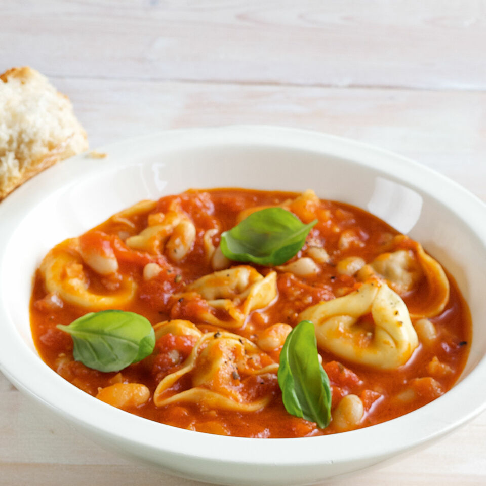 Mehr Eintopf als Suppe: Neben Bohnen und Tomaten sorgen Tortellini dafür, dass auch Pastafans genüsslich beim Anblick eines vollen Suppentellers seufzen!