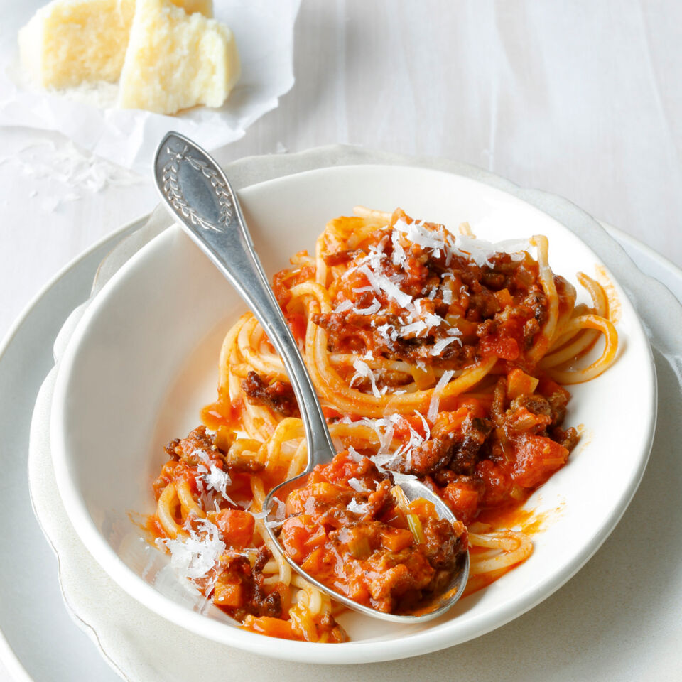Die Sauce Bolognese mit 400-500 g Spaghetti, Linguine oder Tagliatelle und nach Belieben mit frisch geriebenem Parmesan bestreut servieren.