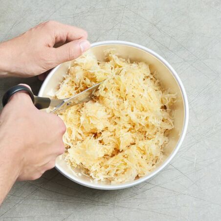 Inzwischen für den Belag das Sauerkraut abtropfen lassen und grob schneiden. Dazu am besten die Küchenschere nehmen und einfach kreuz und quer durch das Kraut schneiden. Den Apfel vierteln und schälen. Das Kerngehäuse herausschneiden und die Apfelviertel würfeln. Die Zwiebel schälen und fein hacken.