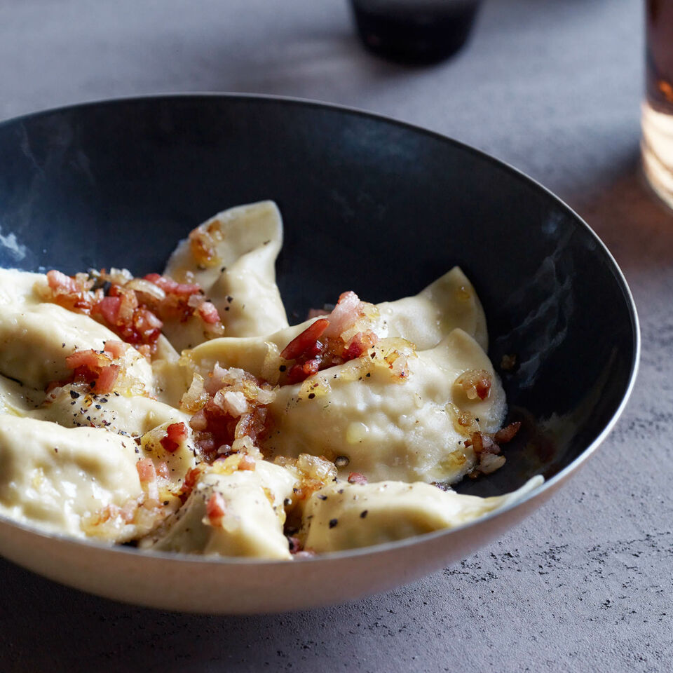 Gleichzeitig in einem großen Topf reichlich Wasser zum Kochen bringen und salzen. Die Piroggen darin ca. 4 Min. leicht sprudelnd kochen lassen. Die Piroggen in einem Sieb abtropfen lassen, in vorgewärmte tiefe Teller geben und mit den Speckzwiebeln garniert servieren.