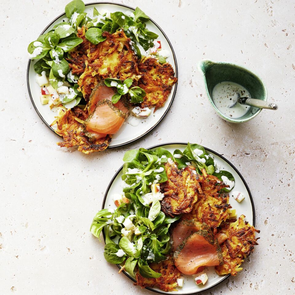 Sauerkraut-Puffer mit Feldsalat und Lachs