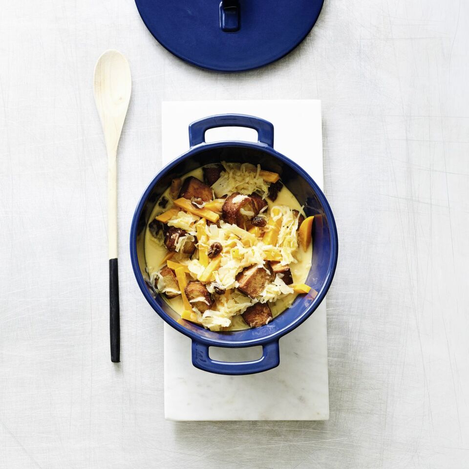 Sauerkraut, Frischkäse, Kümmel und Paprikapulver unter die Süßkartoffeln mischen und den Eintopf noch kurz köcheln lassen, bis das Kraut heiß ist. Mit Salz und Pfeffer abschmecken.