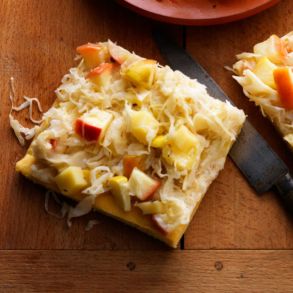 Backofen auf 200° vorheizen. Zwiebel schälen und würfeln. Äpfel waschen, vierteln und entkernen. Viertel in kleine Stücke schneiden. Schmalz in einem Topf erhitzen, Zwiebel und Äpfel darin kurz andünsten. Sauerkraut in einem Sieb abtropfen lassen und dazugeben. Brühe zugießen und alles zugedeckt 10 Min. garen.