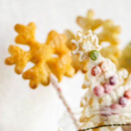 Den Teig mit einem Löffel nach und nach auf das Backblech setzen und mit den Fingern zu Tannenzapfen, Christbaumkugeln, Eiskristallen oder Kerzen formen. Im Backofen in 10-12 Min. goldbraun backen. Die Kekse herausnehmen, mit dem Backpapier vom Blech ziehen und auf einem Kuchengitter abkühlen lassen.
