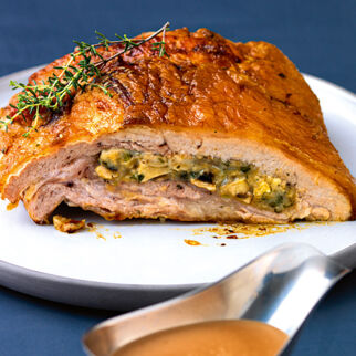 In der Teigmitte einen Teil des Bräts verstreichen, darauf das Schäufele legen. Den Rest des Bräts auf dem Schäufele verstreichen. Teig nun so um das Fleisch formen, dass ein geschlossener Brotlaib entsteht. Auf ein mit Backpapier ausgelegtes Blech setzen und im Ofen (unten) ca. 50 Min. backen, bis das Brot knusprig und das Fleisch gar ist. Machen Sie zum Test die Klopfprobe am Brotboden: Hört es sich hohl an, ist der Teig auch innen durchgebacken.