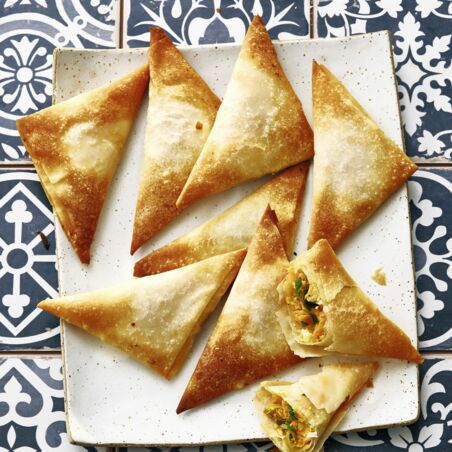 Das entstandene Dreieck nach oben falten, sodass wieder ein Dreieck entsteht. So immer weiter nach oben Dreiecke falten, bis der gesamte Teigstreifen aufgefaltet ist. Die Täschchen rundum mit Butter bepinseln, offene Kanten mit Butter festkleben, dann auf zwei mit Backpapier ausgelegten Blechen verteilen. Die Bleche nacheinander in den heißen Ofen (Mitte) geben und die Täschchen in 20-25 Min. goldbraun und knusprig backen. Auf einem Gitter kurz abkühlen lassen und warm servieren.