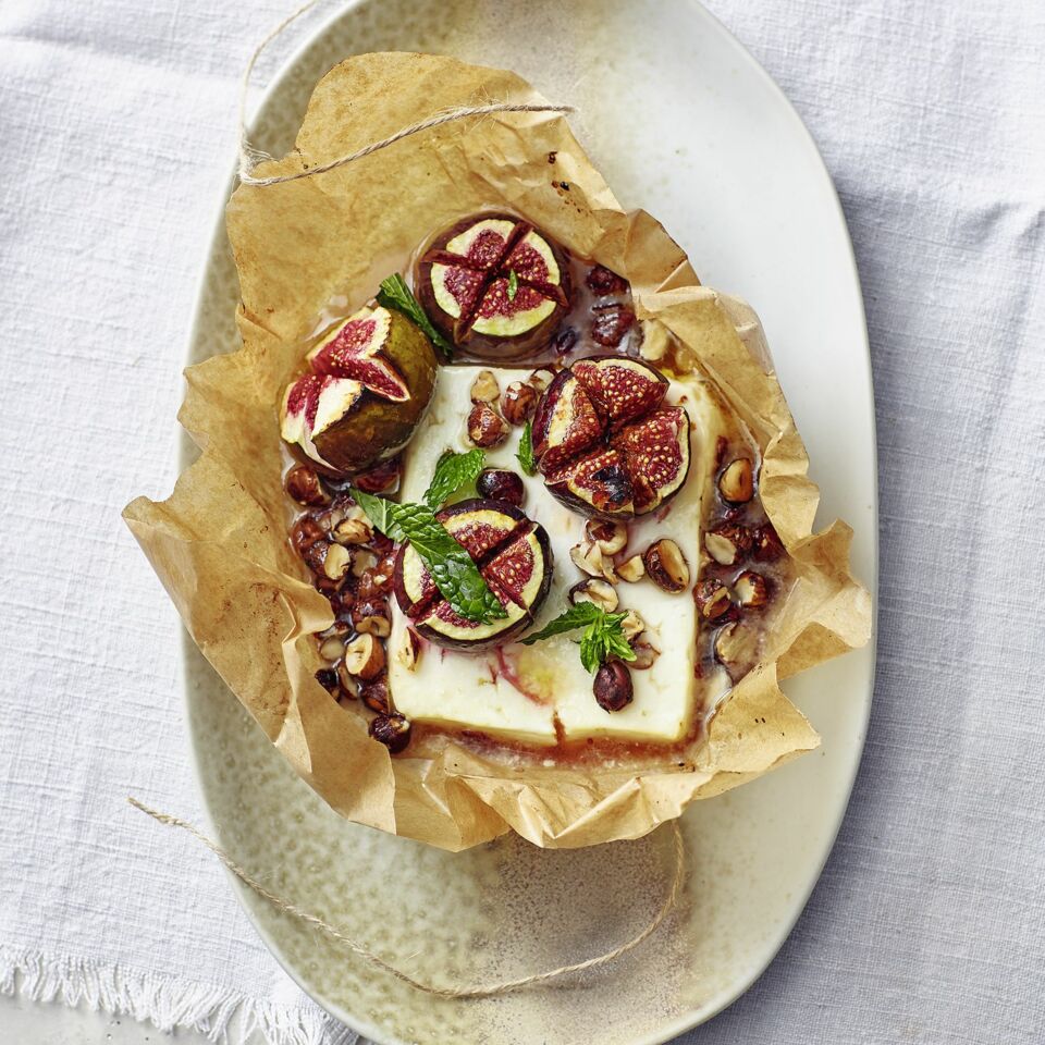 Den Schafskäse in die Mitte eines Bogens Backpapier legen und die Feigen darum herumverteilen. Die Nüsse grob hacken und mit dem Honig über Schafskäse und Feigen verteilen. Das Backpapier über dem Schafskäse zusammenfalten und den Käse im Ofen (Mitte) 20-25 Min. garen.