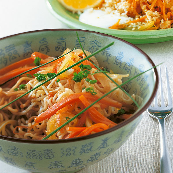 Mit der Brühe ablöschen. Nudeln dazugeben, erhitzen, mit Sojasauce abschmecken, mit Schnittlauchstängeln dekoriert servieren.