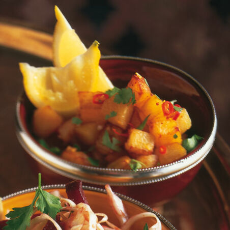 Die vielseitige Knolle einmal ganz anders zubereitet: sanft gebraten, mit Cumin und Harrissa scharf gewürzt mit Koriandergrün und frischen Chiliringen bestreut serviert.
