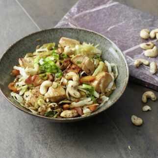 Öl im Wok erhitzen. Kohl darin bei starker Hitze 2 Min. braten. Frühlingszwiebeln, Knoblauch und Chili dazugeben und 1 Min. braten.