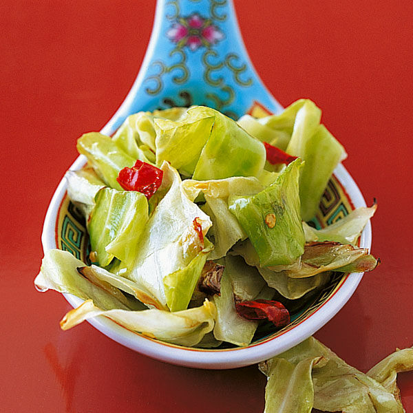 Öl erhitzen. Kohlstreifen und Chili darin 3-4 Min. braten. Reisessig mit Zucker mischen und dazugießen. Kohl salzen und servieren.