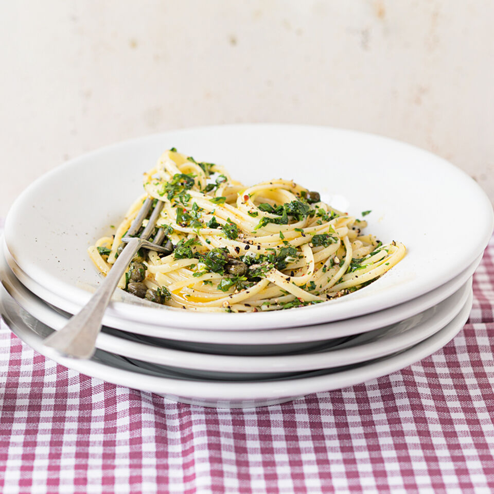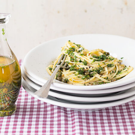 Das Kräuteröl in einem Topf erwärmen. Frisch gekochte Nudeln (z. B. Spaghetti oder Linguine) unterrühren und zuletzt alles mit Salz und Zitronensaft abschmecken.