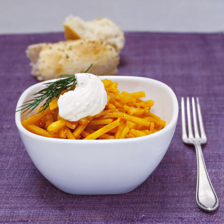 Das Kürbisgemüse in einer Schale oder mittig auf einem Teller anrichten. Den Dillrahm darübergeben und mit etwas knusprigem Fladenbrot genießen.