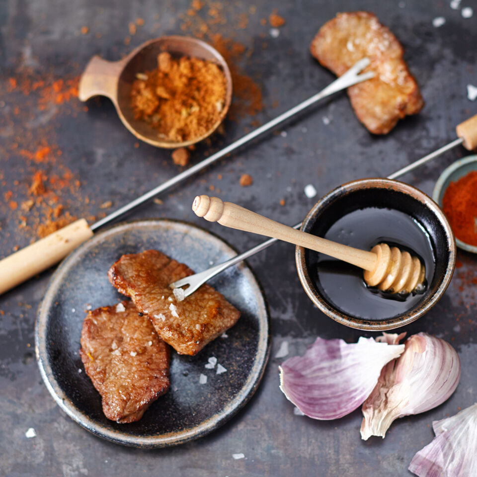 Das Lammfleisch in ca. 4 mm dicke Scheiben schneiden. Knoblauch schälen und durchpressen. Mit Honig, Öl, Ras-el-Hanout, Chilipulver, Zitronensaft, Orangenschale und reichlich Pfeffer gründlich verrühren. Fleisch damit mischen und zugedeckt im Kühlschrank ca. 4 Std. marinieren.