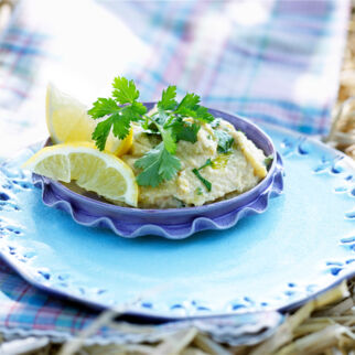 Das Möhrenpüree mit Chili oder gehackter Petersilie und halbierten Zitronenscheiben garnieren.