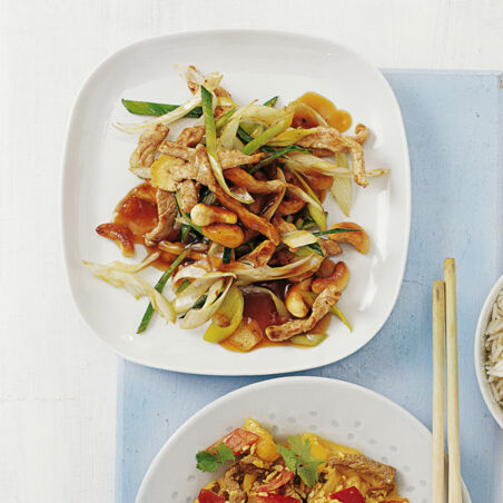 Das Öl in einer Pfanne erhitzen, die Cashewkerne darin goldbraun rösten, herausnehmen. Die Chilischoten anbraten und wieder aus der Pfanne nehmen. Das Fleisch in dem Öl unter Rühren anbraten. Lauch, Ingwer und Knoblauch dazugeben und ca. 5 Min. mitbraten. Die angerührte Speisestärke dazugeben und unter Rühren aufkochen lassen. Die Cashewkerne untermischen. Mit Reis servieren.