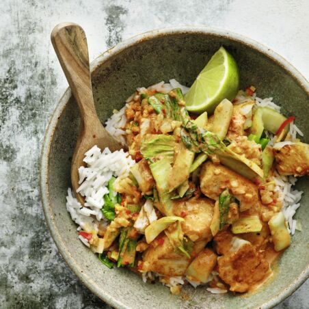 Die Limette halbieren und die Hälften auspressen. Die Fischstücke wieder in die Pfanne geben und kurz erwärmen. Das Curry mit dem Limettensaft beträufeln, mit Salz abschmecken und mit Reis servieren.