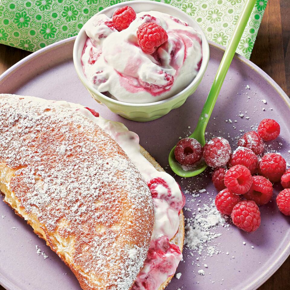 Den Sahnequark auf eine Hälfte der Omeletts verteilen und mit den übrigen Himbeeren belegen. Die andere Hälfte darüberklappen und mit Puderzucker bestäuben.