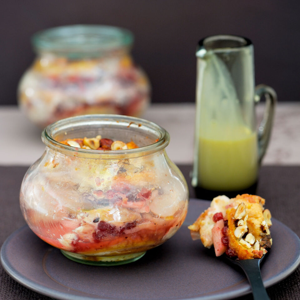 Die Gläser mit wenig Butter einfetten und in Schichten halbvoll füllen. Dabei abwechselnd eine Lage Brötchen, eine Lage Birnenscheiben und 1 TL Preiselbeermarmelade einschichten. Mit einer Lage Brötchen enden. Übrige Eiermilch darübergießen und mit je 1 EL Nüsse bestreuen.