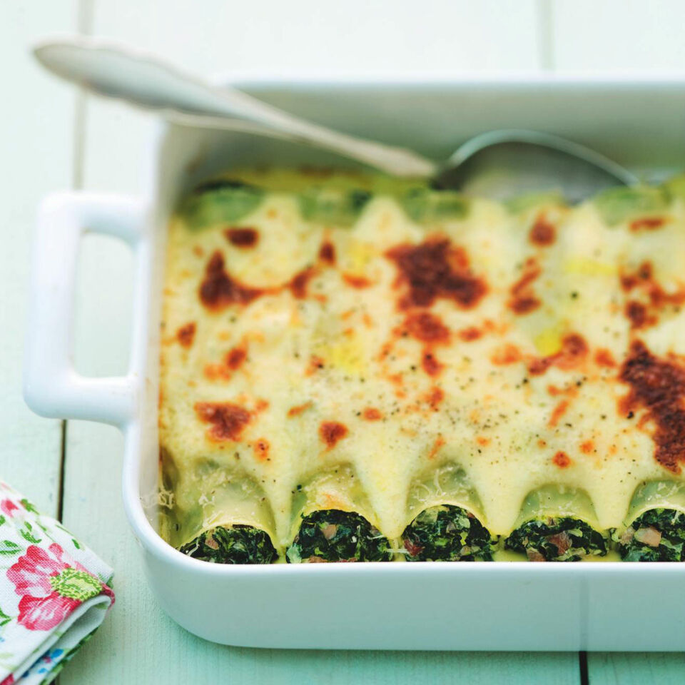 Ein Drittel der Sauce in die Form geben. Die Spinatmasse in die Cannelloni spritzen. Die Cannelloni nebeneinander in die Form setzen. Die übrige Sauce darübergießen. Die Cannelloni mit Parmesan bestreuen und im Ofen (Mitte) in ca. 15 Min. goldbraun backen.