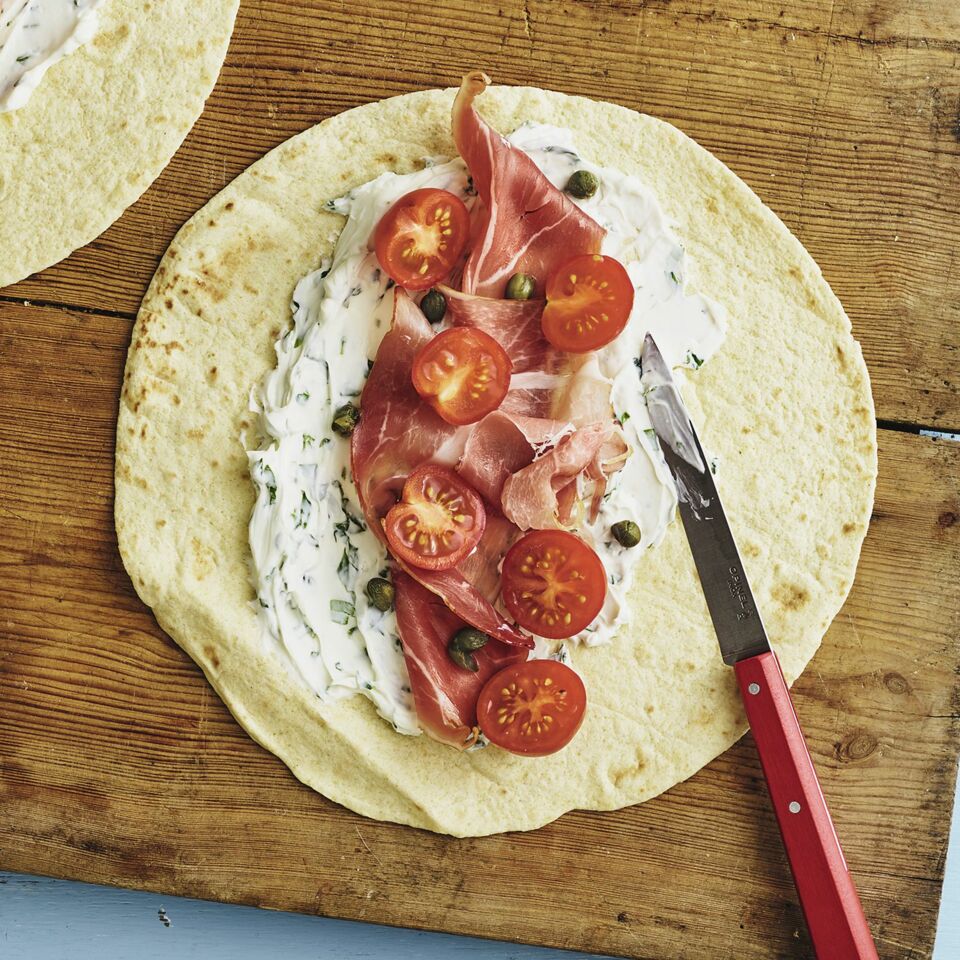 Die Tortillas mit Basilikumfrischkäse bestreichen und mit Schinken, Tomaten und eventuell Kapern belegen. Mit Meersalz und Pfeffer würzen.
