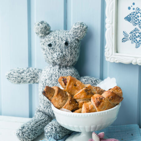 Der Teig für die pikanten Hörnchen ist zwar etwas aufwendig, dafür aber unglaublich mürbe und aromatisch. Wenn’s schnell gehen soll, nehmen Sie fertigen Blätterteig.