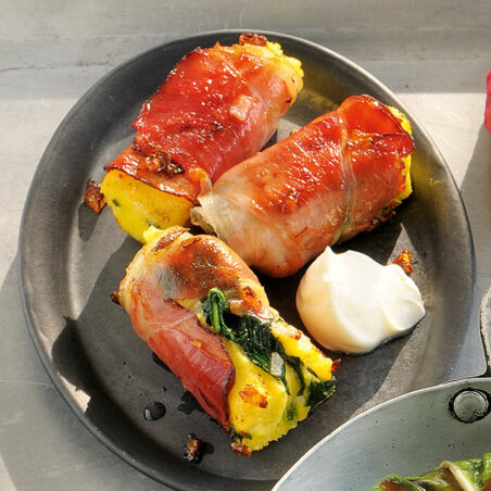 Hauchdünn geschnittener Schwarzwälder Schinken gibt der Polenta eine angenehme Würze und der Blattspinat sorgt für Frische.