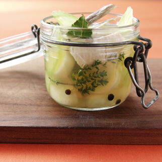 Vor dem Servieren die Sülze in Scheiben schneiden und nach Belieben unter dem Backofengrill ganz leicht anwärmen.