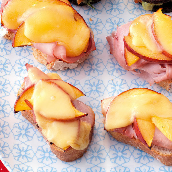 Den Pfirsich oder die Nektarine waschen, halbieren, den Kern entfernen und die Hälften in Spalten schneiden. Schinken- und Käsescheiben halbieren. Baguettescheiben erst mit Schinken, dann mit Pfirsich- bzw. Nektarinenspalten und zum Schluss mit dem Käse belegen. Aufs Backblech legen.