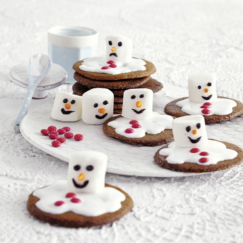 Da geht nicht nur Kindern das Herz auf: Kleine Schneemänner aus Marshmallows, Zuckerschrift und Schokolinsen schmelzen auf diesen Cookies dahin.