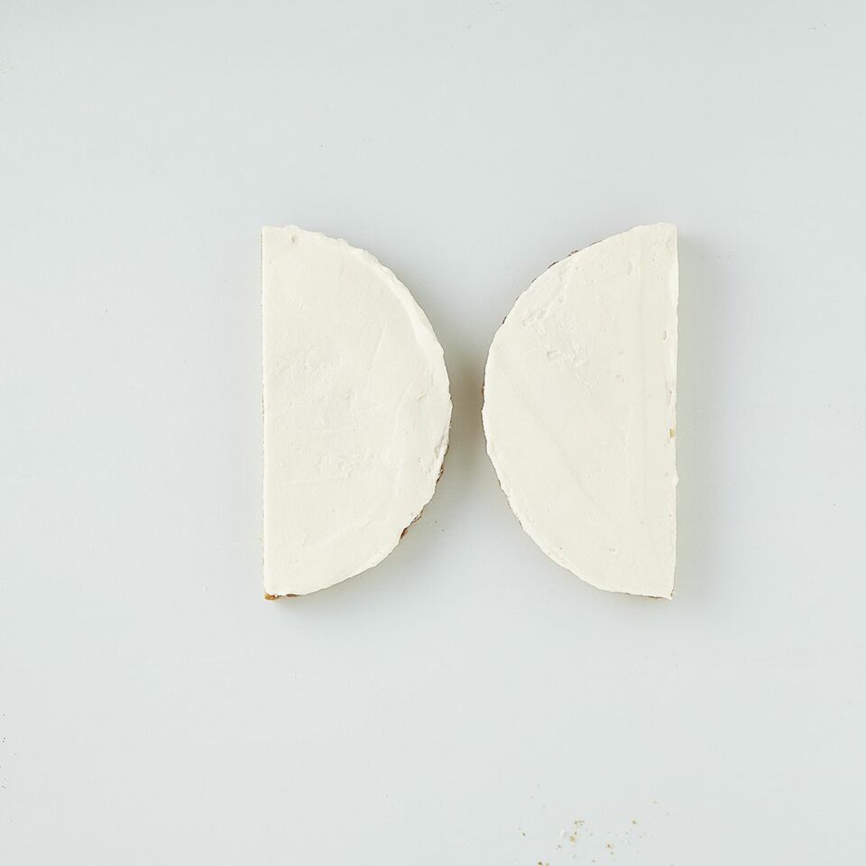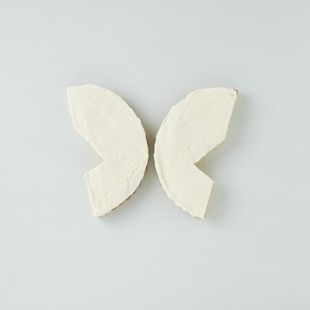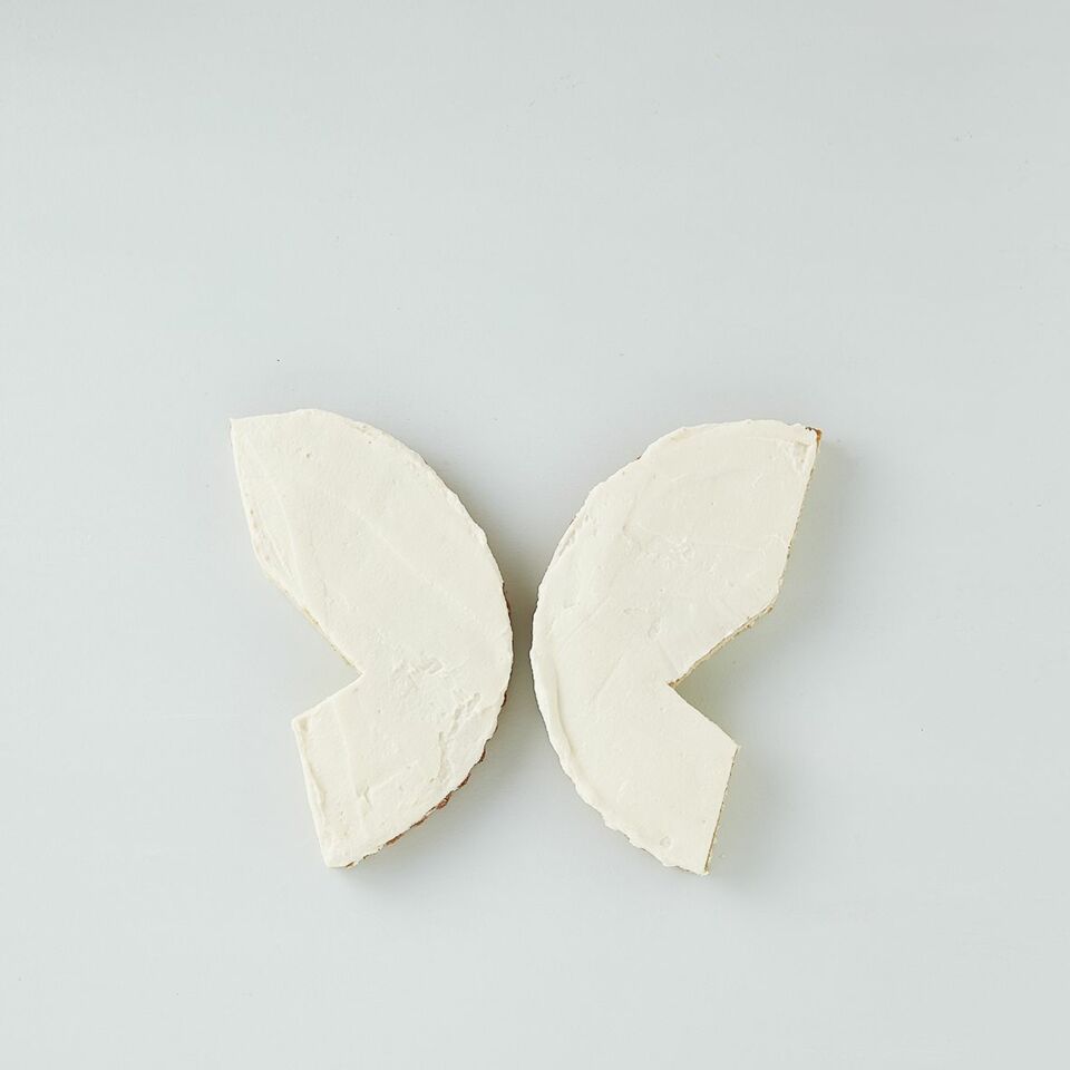 Die Torte mit einem Messer so halbieren, dass zwei Halbkreise entstehen. Die Halbkreise mit der Rundung zueinander drehen. Für die Schmetterlingsflügel ein Stück unterhalb der Mitte rechts und links jeweils ein kleines Tortenstück herausschneiden.