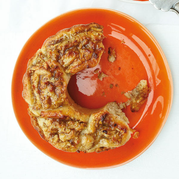 Den Teig auf wenig Mehl zu einem Rechteck von etwa 20 x 30 cm ausrollen. Füllung darauf verteilen und von der kurzen Seite her aufrollen. In 6 dicke Scheiben schneiden, nebeneinander in die Form legen. Im Backofen (Mitte, Umluft 180°) ca. 30 Min. backen. Aus dem Ofen nehmen, kurz ruhen lassen, dann auf ein Kuchengitter stürzen. Gelee glatt rühren und die Oberseite des heißen Kuchens damit bestreichen.