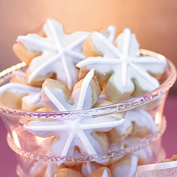 Den Backofen auf 180° (Umluft 160°) vorheizen, Backblech mit Backpapier auslegen. Den Teig auf einer leicht bemehlten Arbeitsfläche 3-4 mm dick ausrollen. Mit einem Ausstecher Schneeflocken ausstechen, aufs Blech legen und im Ofen (Mitte) in 10-12 Min. goldgelb backen. Auskühlen lassen.