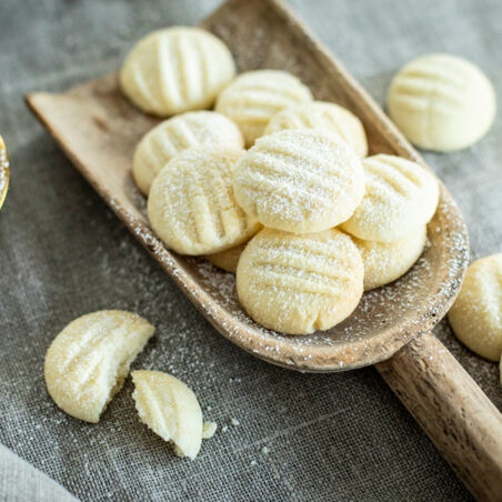 Mehl und Speisestärke in einer Schüssel vermengen und mit Buttermasse zu einem glatten Teig verkneten. Teig zu 3 Rollen (Ø 3 cm) formen und ca. 30 Minuten kühl stellen.