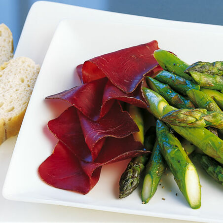 Blitzschnell zubereitet - denn grüner Spargel muss nicht geschält werden. Mit würzigem Bündner Fleisch kombiniert - ein Hochgenuss.