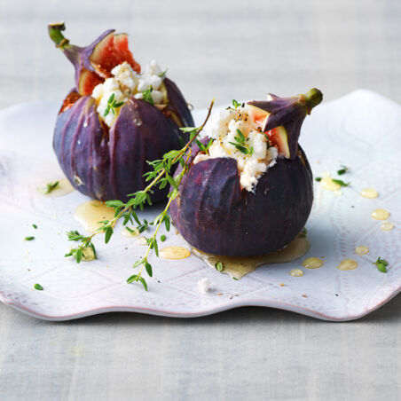 Den Ziegenkäse zerbröseln und in die Mitte der Feigen verteilen. Den Thymiansirup darüberträufeln. Mit etwas Salz würzen und mit dem schwarzen Pfeffer übermahlen. Den beiseitegelegten Thymian darüberstreuen. Dazu passt knuspriges Baguette.