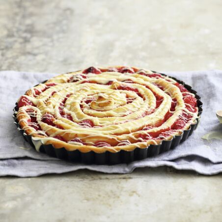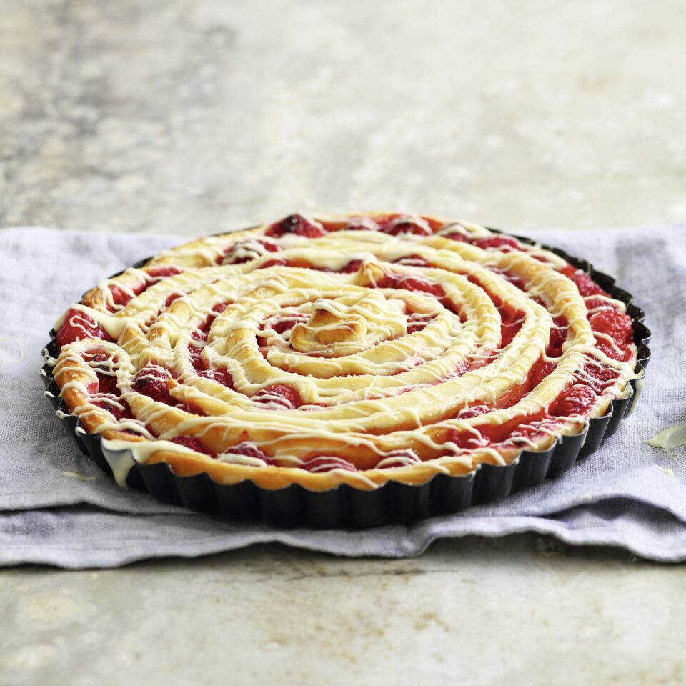 Den Backofen auf 200° vorheizen und die Backform einfetten. Den Blätterteig entrollen und dünner ausrollen. Die Himbeeren vorsichtig waschen und trocken tupfen.