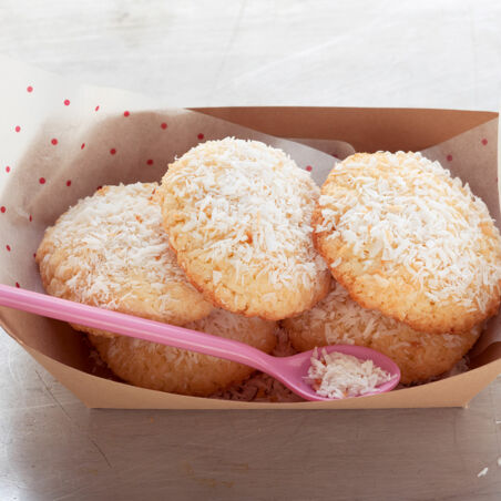 Den Backofen auf 180° (Umluft 160°) vorheizen. Zwei Backbleche mit Backpapier auslegen. Das Mehl mit Backpulver und Kokosraspeln vermischen.