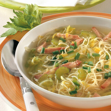 Die Brühe zum Kochen bringen, die Gemüsestreifen und die Nudeln hineingeben und in etwa 5 Min. darin bissfest garen.