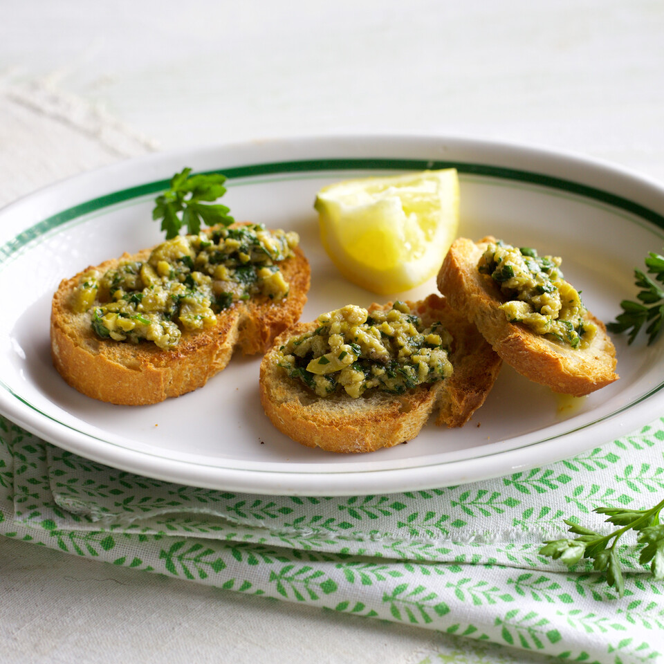 Die Oliven vom Stein schneiden. Die Petersilie waschen und trocken schütteln, die Blätter abzupfen und grob hacken. Den Knoblauch schälen und ebenfalls grob hacken. Die Sardellen kalt abbrausen, trocken tupfen und mit den Kapern hacken. Alles mit dem Öl zu einer feinen Paste pürieren. Die Zitrone heiß waschen und abtrocknen, die Schale abreiben und den Saft auspressen. Olivenmus mit ½ TL Zitronenschale, ca. 2 TL Zitronensaft, Salz und Pfeffer würzen.