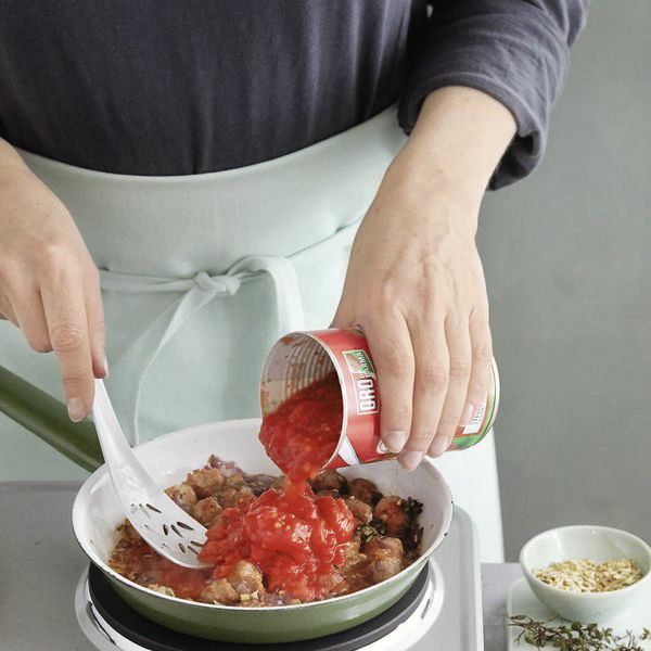 Das Olivenöl in einer Pfanne erhitzen. Die Zwiebel, den Knoblauch, die Fenchelsamen und den Thymian kurz darin andünsten. Die Bratwurststücke dazugeben und unter Rühren leicht braun braten. Die Tomaten hinzufügen. Die Sauce mit Salz und Pfeffer würzen und offen sanft köcheln lassen, bis die Nudeln fertig gegart sind.