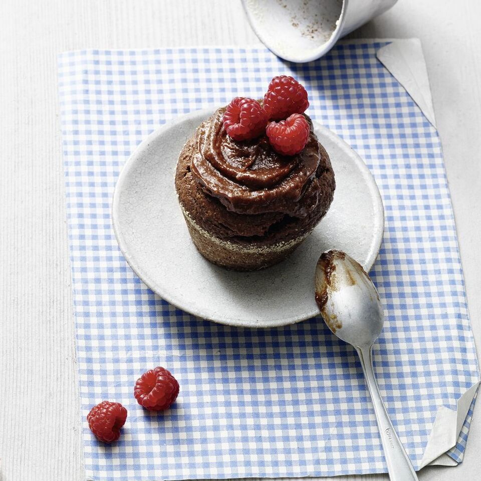 Die Oberfläche der Küchlein mit der übrigen Creme bestreichen. Himbeeren nur falls nötig abbrausen und trocken tupfen. Die Beeren dekorativ auf die Küchlein setzen, servieren.