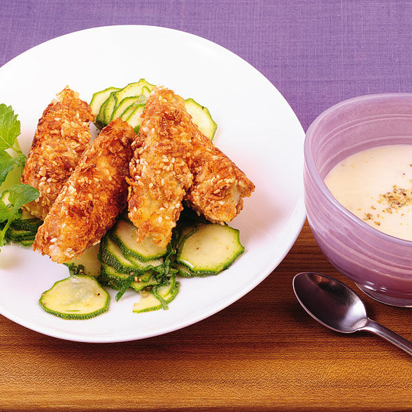 Mehl auf einen Teller geben, das Ei in einem tiefen Teller verquirlen, Cornflakes zerbröseln und mit dem Sesam auf einem dritten Teller mischen. Öl in einer Pfanne erhitzen. Den Fisch im Mehl wenden, durch das Ei ziehen und in der Cornflakes-Mischung wenden. Im heißen Öl bei mittlerer Hitze pro Seite in je 3-4 Min. goldbraun braten, auf Küchenpapier abtropfen lassen. Mit Zucchini und Dip servieren.